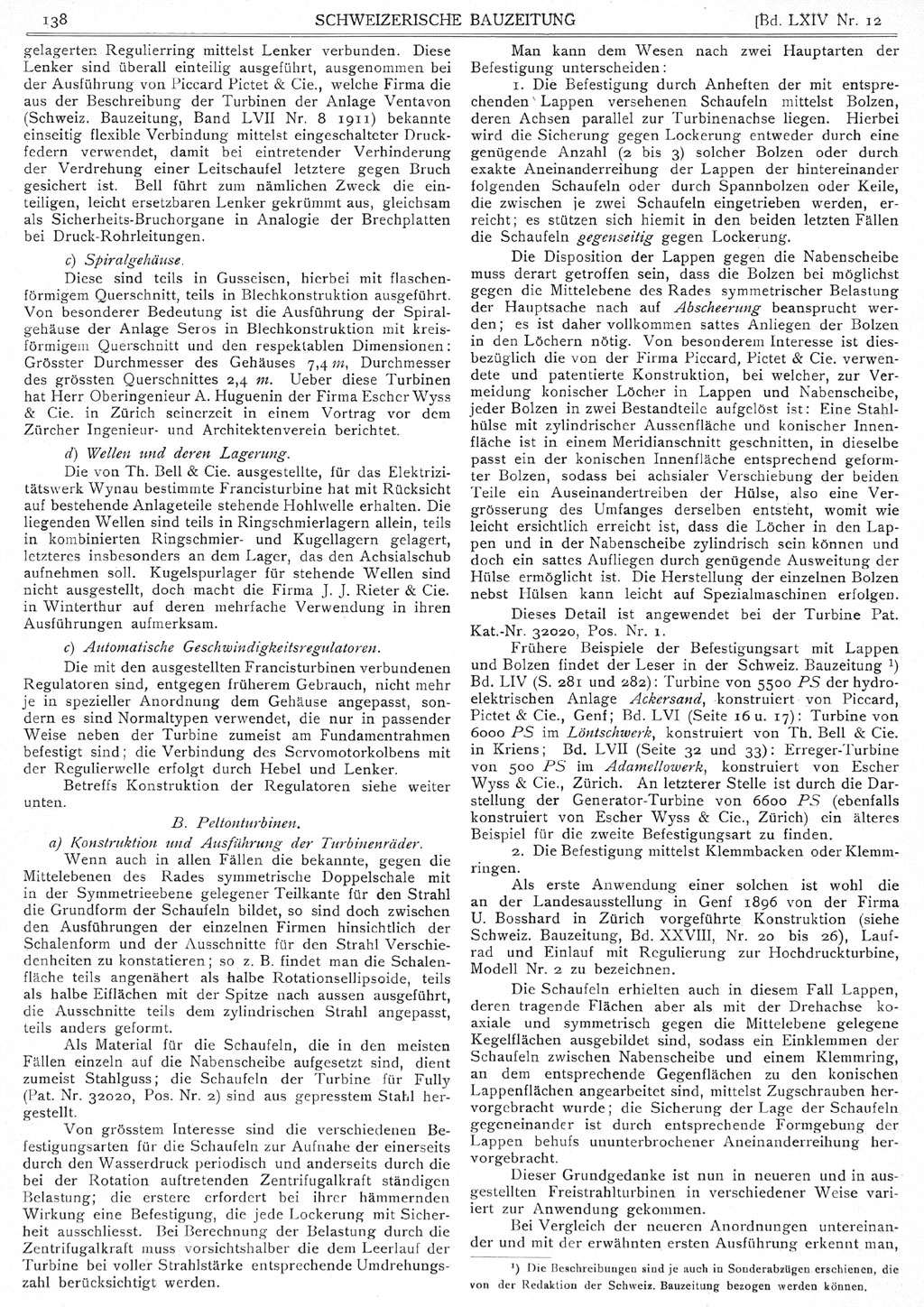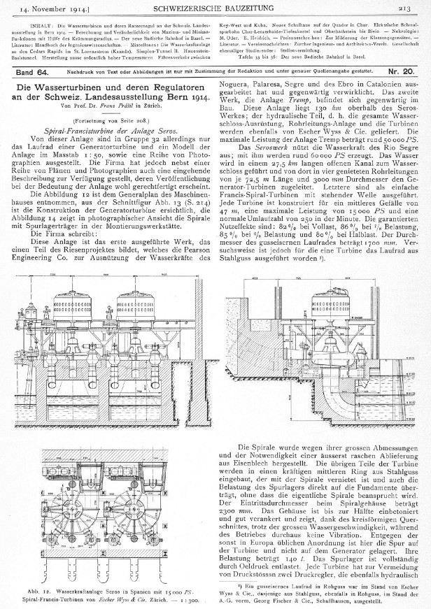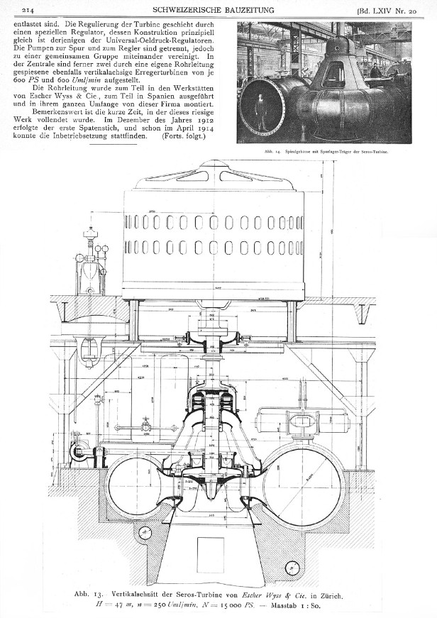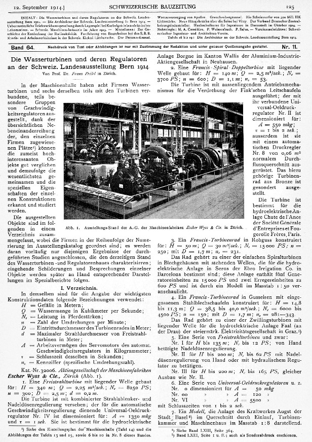 Peltonturbine für die Anlage BorgneSoc. An. des Ateliers Piccard, Pictet & Cie. GenèveSpiral-Francisturbine für die Anlage „Chute de l’Ance“Spiral-Francisturbine der Anlage SerosGeschwindigkeits-Regulatoren von Escher Wyss & Cie. ZürichDie Pelton-Turbine für Saaheim