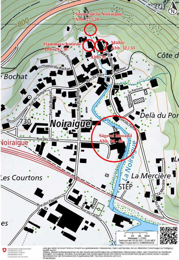 Von den insgesamt acht Wasserkraftnutzungen, die die Eidgenössische Wasserkraftstatistik 1914 am Bach Noiraigue ausweist, wird heute kein einziges mehr betrieben. Spuren sind nur noch von drei Werken vorhanden. Die erwähnte Mühle und Hammerschmiede und weiter unten die Scierie de Noiraigue SA (Rue du Collège 4).